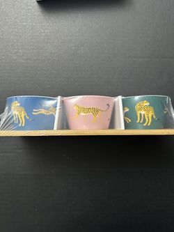 NWT Wildlife Ceramic Dish Set 3 Bowls Tidbit Cheetah Graphic With Bamboo Tray $8Lake Elsinore, CA