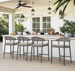 Bar Stools Set of 4, 24.8'' Aluminum Outdoor Bar Stool with Removable Cushion, Boho Rattan BarStools, Olefin Rope Woven Bar Chairs with Footrest for P$220Murrieta, CA