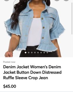 Size L Denim Jacket Women's Denim Jacket Button Down Distressed Ruffle Sleeve Crop Jean$5Irwindale, CA