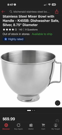 KitchenAid 4.5 Quart Polished Stainless Steel Mixer Bowl with Handle - K45SB: Dishwasher Safe, Silver, 8.75" Diameter$60Marysville, WA