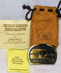 Vintage 70s Seattle Seahawks Solid Brass Belt Buckle Heritage Bank COMPLETE ALL