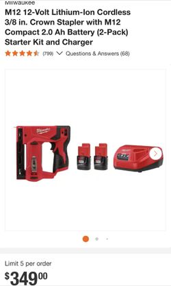 Milwaukee M12 3/8 in. Crown Stapler with M12 Compact 2.0 Ah Battery (2-Pack) Starter Kit and Charger$280San Jose, CA