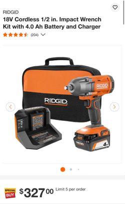 RIDGID 18V Cordless 1/2 in. Impact Wrench Kit with 4.0 Ah Battery and Charger$180San Jose, CA