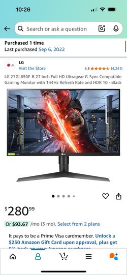 LG 27GL650F-B 27 Inch Full HD Ultragear G-Sync Compatible Gaming Monitor with 144Hz Refresh Rate$80Pasadena, CA