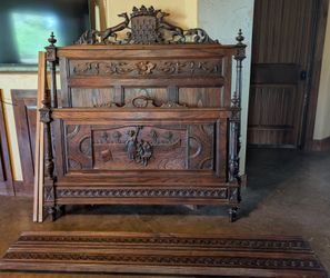 Oak Carved French Breton Antique Wooden Bed Frame w/Brittany Coat of Arms (Full Size Bed)