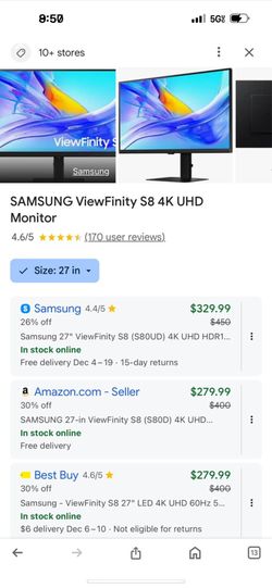 New Samsung S80A 27" 4K HDR10 LED Monitor USB C Built-in Speakers LS27A800UNNXZA$200Sacramento, CA