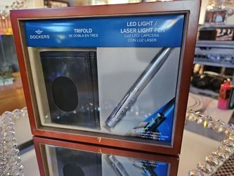 New In Package! Vintage, Dockers gift set featuring a black trifold wallet and a silver LED light/laser pointer pen.