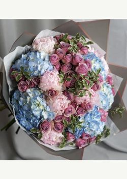 PURE FANTASY - BOUQUET OF PURPLE SPRAY ROSES, PASTEL PEONIES, BLUE HYDRANGEAS$180Grand Terrace, CA