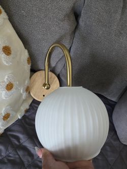 Battery Operated Modern Wood Wall Sconce Globe Glass Wall Light Gold Bedside Wall Mount Lamp with Milk White Stripe Glass Shade, Nordic Solid Wood Wal$40Riverside, CA