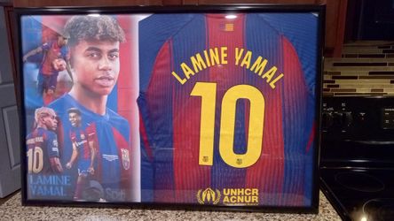 LAMINE YAMAL OF THE BARCELONA SOCCER TEAM CUSTOM,BRANDED, AUTHENTIC FRAMED JERSEY.$60Wimauma, FL