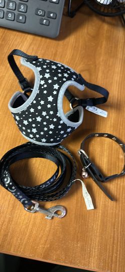 Harness, Leash and collar Set. Tiny cat or dog moon and stars harness, collar and leash set. Black and Gray. Leash is 60” long.$10Boca Raton, FL