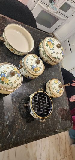 German ASTA Floral Cookware Set Brass Handle Enamelware 10 Piece Set with lids.