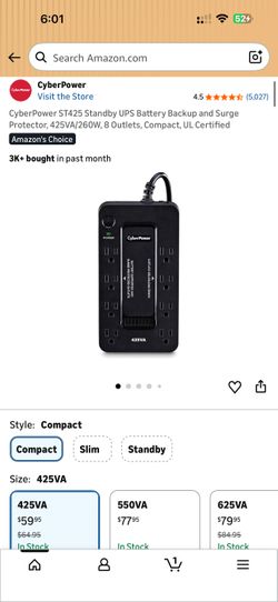 CyberPower ST425 Standby UPS Battery Backup and Surge Protector, 425VA/260W, 8 Outlets, Compact, UL Certified$50Miramar, FL