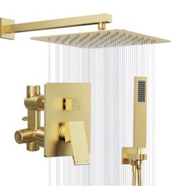 Gold Shower System, 10'' Square Rainfall Shower Head with Handheld Combo Spray, Bathroom Brushed Gold Shower Faucet Set with Valve, 59'' Shower Hose, $125Houston, TX