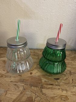 2 Vtg Christmas Tree Holiday Time Green & White Glass Sippers With Straws Lids$20Hondo, TX