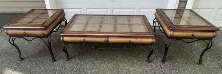 Vintage Coastal Hardwood, Rattan & Glass Coffee Table + Matching Side Tables (Set of 3)$425Redmond, WA