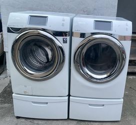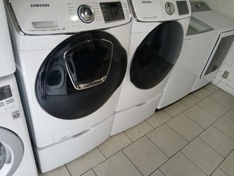 SAMSUNG WHITE STEAM 8" LCD SCREEN TOUCHSCREEN STEAM FRONT LOAD WASHER AND GAS DRYER SET WITH PEDESTAL $699Fullerton, CA