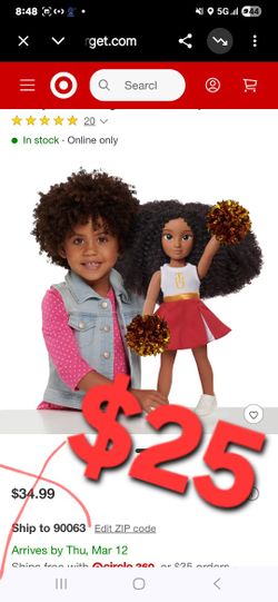Doll Features: 18-inch doll with curly hair, medium brown skin tone, and 5 points of articulation.
