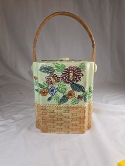 Antique Vtg Large Ceramic Cookie Jar w Rattan Handle Block & Floral Design JAPAN$60Tucson, AZ