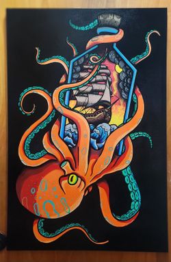 Octopus With Ship In A Bottle 36x24 In Trad Tattoo Painting $400Los Angeles, CA