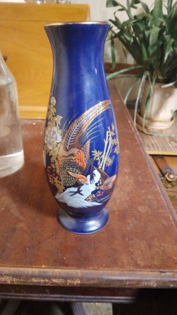 Beautiful Vintage Cobalt Blue Porcelain Vase Decorated w Pheasants & Gold Trim
