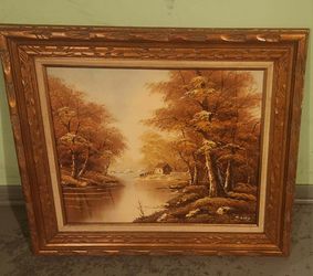 vintage framed oil painting depicting an autumn landscape with a river and a cabin, $45Chicago, IL