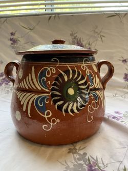Vintage Mexican Tlaquepaque Redware Pottery Bean Pot w/Lid Hand Painted$35Placerville, CA