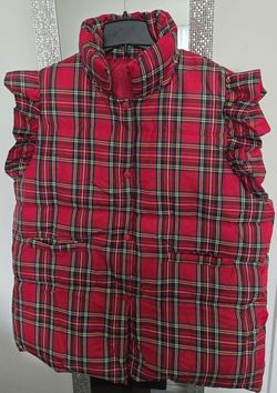 Chaleco Acolchonado Con Diseño A Cuadros Con Volantes Y Bolsillos Para Mujer, Sin Mangas Medida XL Color Rojo Con Rayas Azules $15Los Angeles, CA