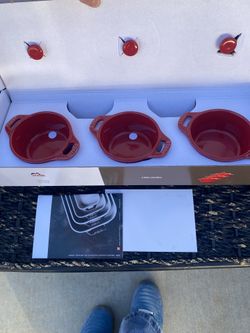 Staub red ceramic 3-piece mini pots set $40Murrieta, CA