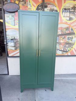 A green metal storage wardrobe with 2 adjustable shelves, featuring a stacking area and a hanging area. It can be used as a tool cabinet or wardrobe i$100Pomona, CA