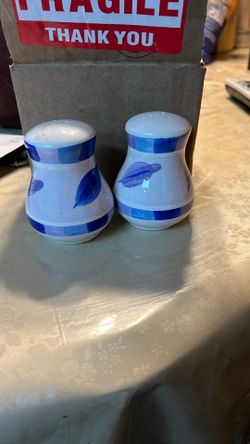 vintage Royal Norfolk ceramic salt and pepper shakers with a blue, purple, and white leaf design$20Perris, CA