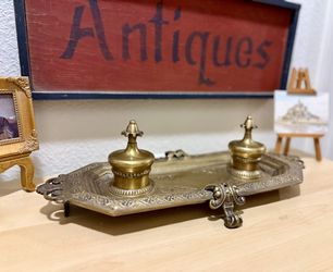 Beautiful Ornate Brass Castilian Desk Set w Lidded Ink Wells, Intricate Scrollwork, Large Pen Tray, Claw-Footed Tray, Vintage, RARE $75Oceanside, CA