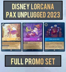PAX Unplugged 2023 Disney Lorcana Promo Cards - Rapunzel, Pinocchio, Four Dozen Eggs$200San Gabriel, CA