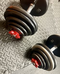 Set of Cast Iron Adjestables Dumbbells With Weight Plates: 10s, 7.5s, 5s, 2.5s and 1.25 pounders. Brute W: 115 #$140Monterey Park, CA