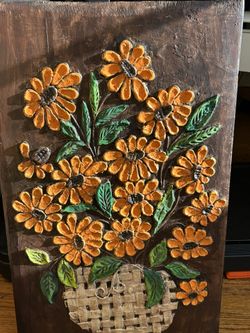 Vintage Solid Wood Sculpture Art Still Life Mid Century Wall Hanging Retro Painting Artwork Boho Farmhouse Cottage Core MCM Flowers Framed $55San Diego, CA