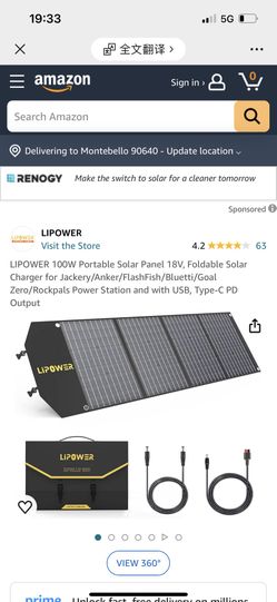 LIPOWER 100W Portable Solar Panel 18V, Foldable Solar Charger for Jackery/Anker/FlashFish/Bluetti/Go$75Rosemead, CA
