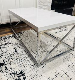 A modern contemporary coffee table with a glossy white top and a chrome metal base.$75Lawrenceville, GA