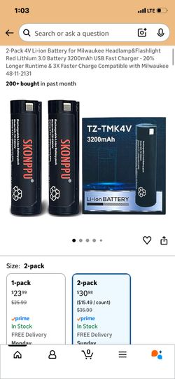 2-Pack 4V Li-ion Battery for Milwaukee Headlamp&Flashlight Red Lithium 3.0 Battery 3200mAh USB Fast Charger - 20% Longer Runtime & 3X Faster Charge Co$20Dallas, TX