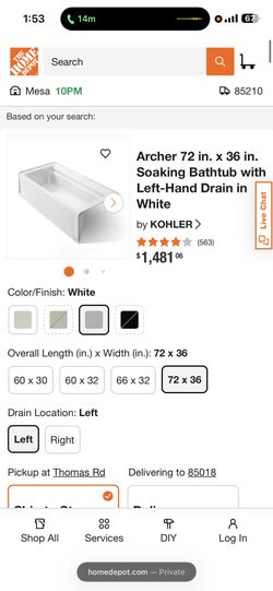 Archer 72 in. x 36 in. Soaking Bathtub with Left-Hand Drain in White$800Mesa, AZ