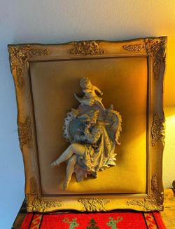 PAREJA DE CUADRO ANTIGUO EN TERCERA DIMENCION MARCO DORADO ACOLCHONADO Y ANGELES DE PORCELANA $200Hialeah, FL