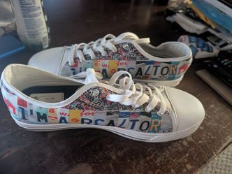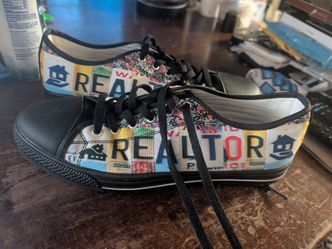 White canvas low-top sneakers - size M10/F12/EU44 with custom "I'M A REALTOR" license plate design.$50Round Lake Heights, IL