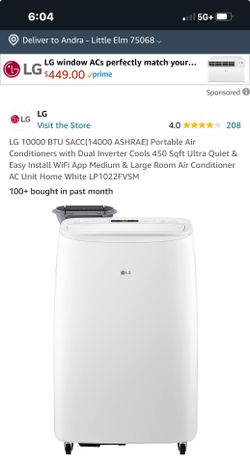 LG Dual Inverter 10000-BTU DOE (115-Volt) White Vented Wi-Fi enabled Portable Air Conditioner with Remote Cools 450-sq ft$350Oak Point, TX