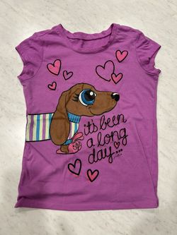 Purple kids t-shirt with a dog and heart print. Text: 'It's been a long day'.$2Homestead, FL