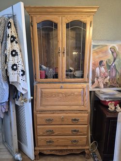oak secretary desk with a hutch top, featuring beveled glass doors, a drop-front writing surface, and lower drawers.$50Hesperia, CA