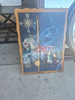 a vintage Sue Dawe carousel horse wall clock from the 1980s, featuring a fantasy art design often found on souvenirs and home decor from that era.$10Hesperia, CA