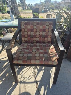 upholstered wooden accent chair featuring a geometric circle pattern fabric and dark wood arms and legs.$10Hesperia, CA