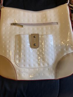 Arcadia White And Tan Adjustable Strap Patent Leather Embossed Handbag$40Tinley Park, IL