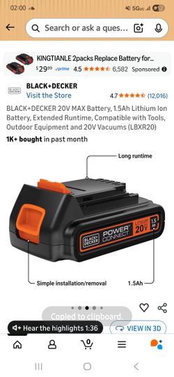 BLACK+DECKER 20V MAX Battery, 1.5Ah Lithium Ion Battery, Extended Runtime, Compatible with Tools, Outdoor Equipment and 20V Vacuums (LBXR20)$20Las Vegas, NV