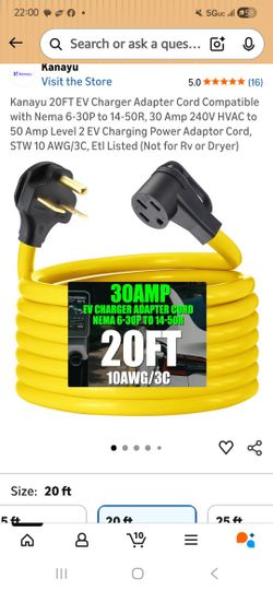 Kanayu 20FT EV Charger Adapter Cord Compatible with Nema 6-30P to 14-50R, 30 Amp 240V HVAC to 50 Amp Level 2 EV Charging Power Adaptor Cord, STW 10 AW$25Las Vegas, NV
