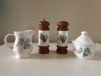Pfaltzgraff Grapevine Mr Dudley Salt & Pepper Mill, Sugar Bowl & Creamer White Grapes Flowers Set$15Phoenix, AZ